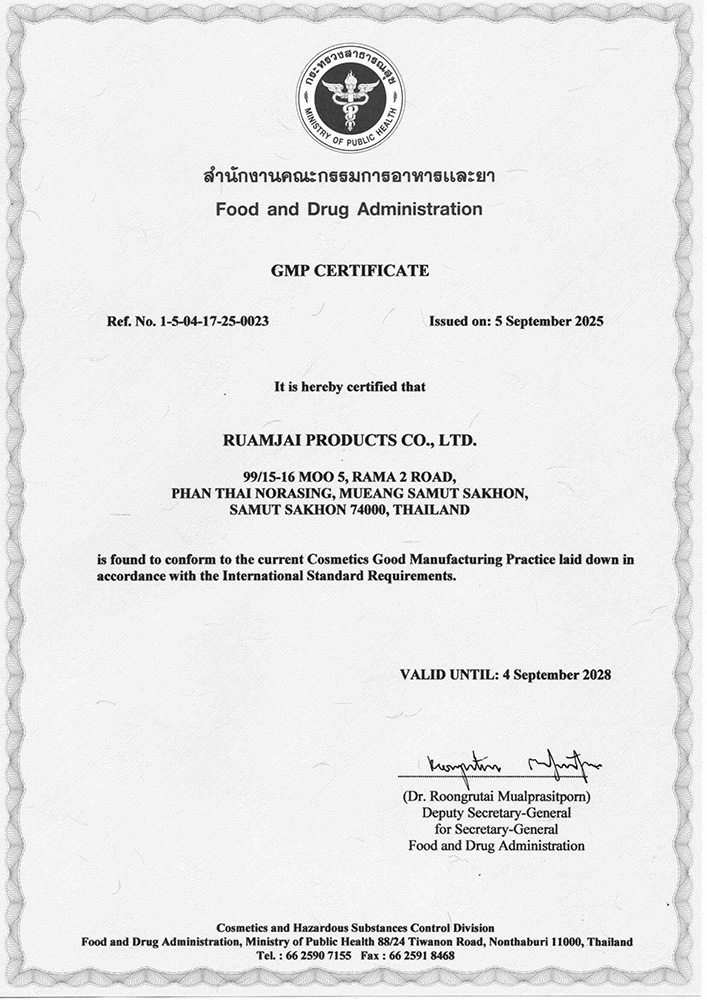 Công ty Ruamjai Products được chứng nhận đạt tiêu chuẩn sản xuất mỹ phẩm bởi Cục Quản lý Thực phẩm và Dược phẩm thuộc Bộ Y tế. Mọi sản phẩm của chúng tôi đều có số công bố sản phẩm.